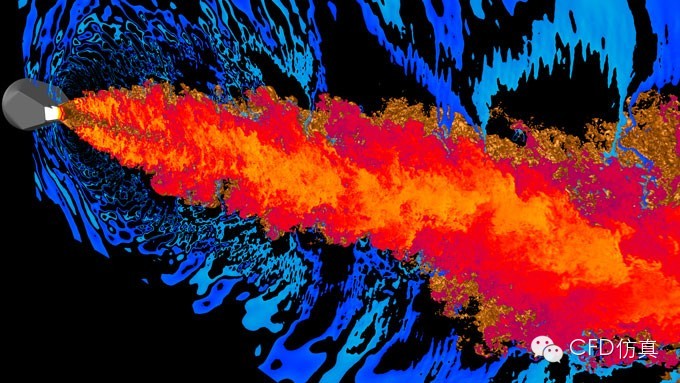 上图是喷气机噪声仿真中的图片之一,左边的灰色物体即为一种新设计的引擎排气口,橙红色部分代指排气温度,蓝绿色部分代指声场。排气口边缘呈V形可以加强湍流的混合,从而减少噪音。图片来源:斯坦福大学湍流研究中心