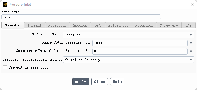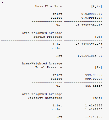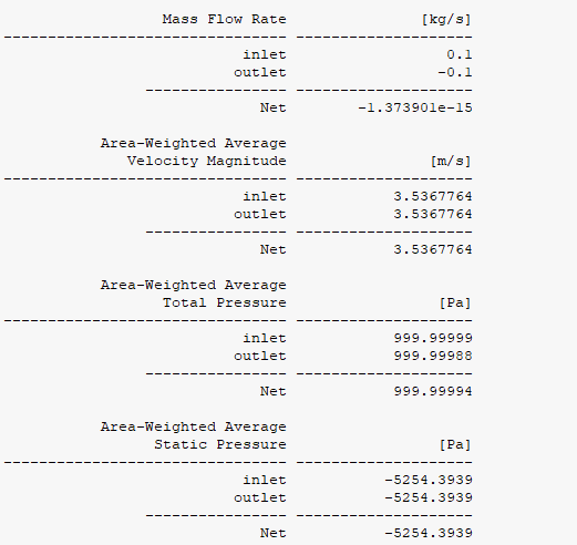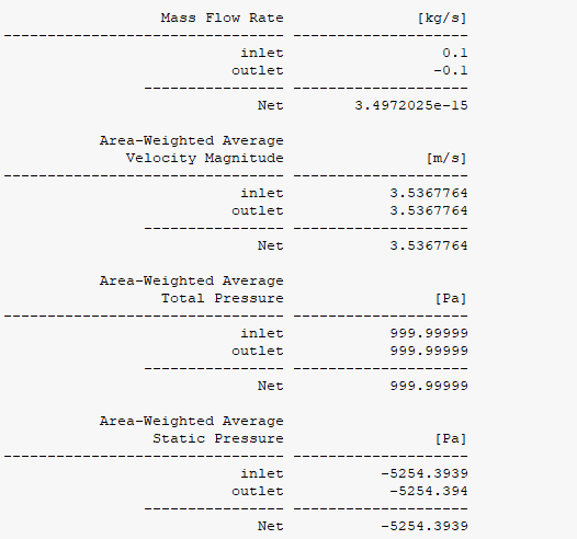 输入的目标流量得到了保证,总压也在预期内。然而出口静压变了,并不等于输入的0 Pa。可以看出如果在压力出口对话框中指定了目标流量,则求解器会优先保证流量,静压值根据总压和流量计算得到。