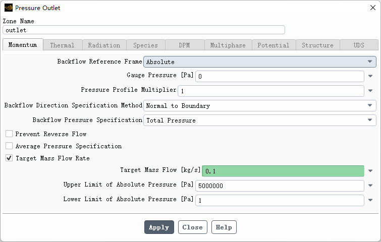 压力出口边界可以指定Target Mass Flow Rate,如下图所示,指定出口流量为0.1 kg/s,看看会出现什么情况。