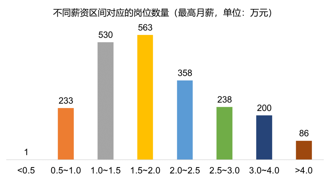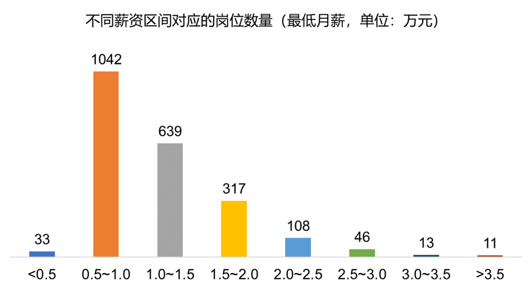 统计了最低月薪分布,如下图所示。最低月薪大致分布在0.5~2.0w范围区间,其中接近一半的职位最低月薪落在0.5-1.0范围内,有接近三成的职位最低薪资落在1.0-1.5范围内,接近15%的职位最低薪资落在1.5-2.0范围内。