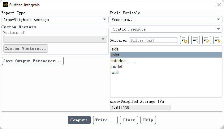 面积加权平均在后处理时应用非常频繁。通常在统计某个面的温度、压力等标量平均值时采用此方式。如下图所示,统计边界inlet上的平均压力。