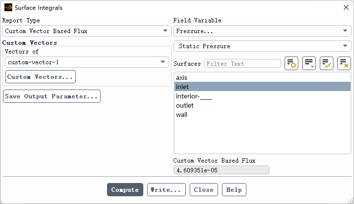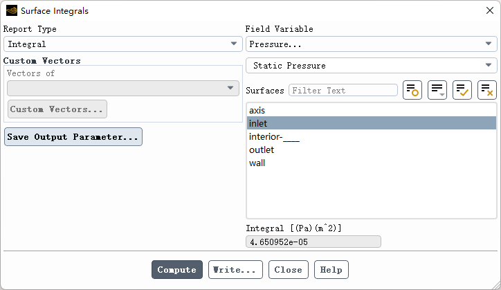 可以计算物理量对指定面的积分。如下图所示,指定inlet面上的压力积分。。