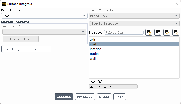 Area通常用于计算指定面的面积,如下图所示可以计算得到边界inlet的面积。