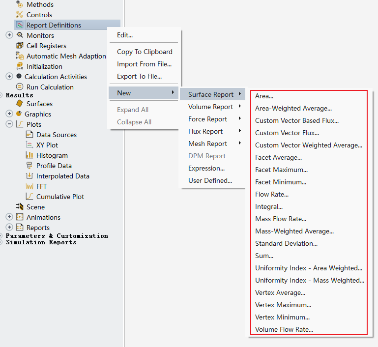 在Fluent中创建监测面报告时,如下图所示,有非常多的监测类型。本文描述这些不同类型的计算方式。