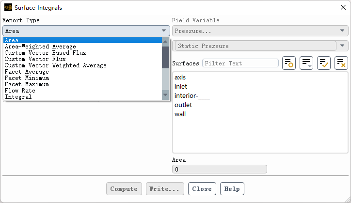 在计算完毕后,也可以通过模型树节点Surface Integrals打开面积分对话框,其中Report Type也包含这些不同的类型,如下图所示。