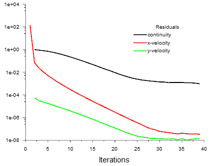 计算在39步收敛,计算总耗时16秒(至强X5650单核,内存16 G 计算 )。残差如下图所示。