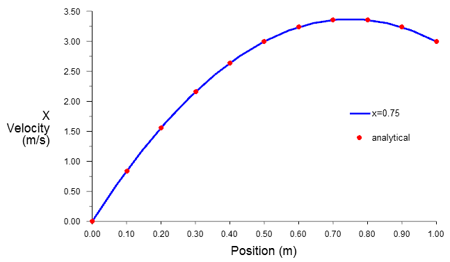 绘制x=0.75m位置x-velocity分布,并与解析解比较,如下图所示