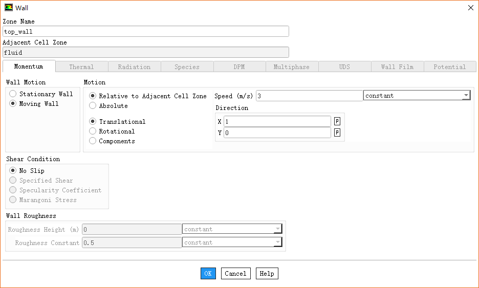 鼠标双击模型树节点Boundary Conditions > top_wall弹出设置对话框,激活选项Moving Wall,设置Motion为Translational,并设置Speed为3 m/s