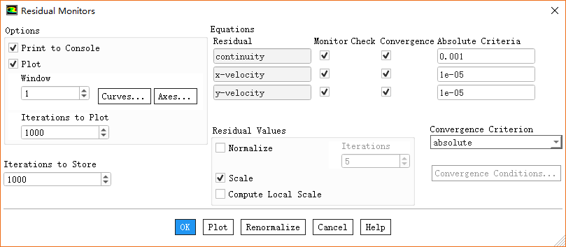 双击模型树节点Monitors > Residual,弹出设置对话框,如下图所示设置残差标准为