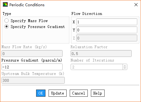 鼠标双击模型树节点Boundary Conditions,点击右侧面板按钮Periodic Conditions…,弹出设置对话框,如下图所示,设置Type为Specify Pressure Gradient,指定Pressure Gradient为-12 pa/m