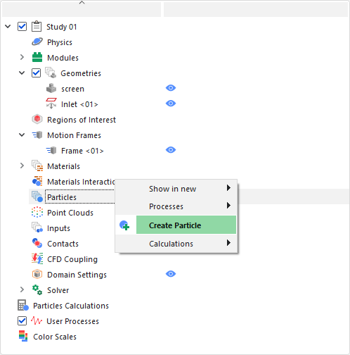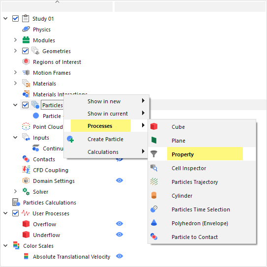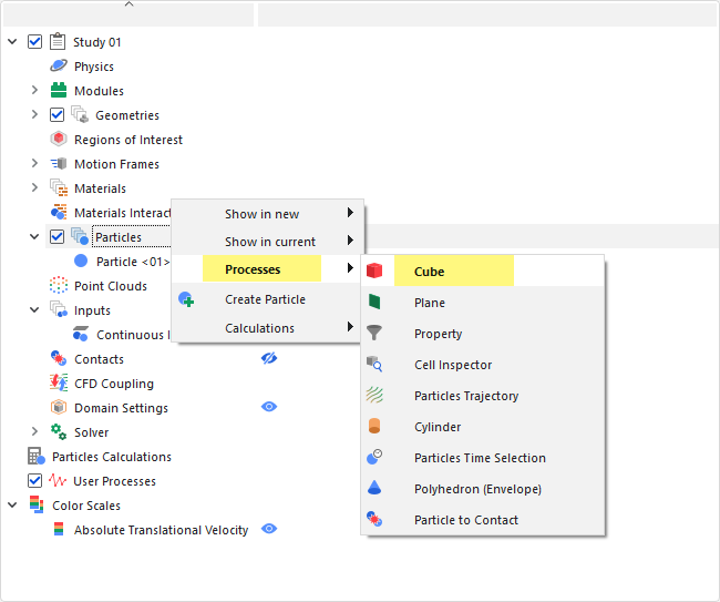 右键选择模型树节点 Particles,点击弹出菜单项Processes → Cube