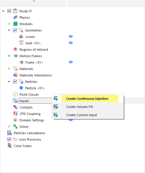右键选择模型树节点 Inputs,点击弹出菜单项Create Continuous Injection