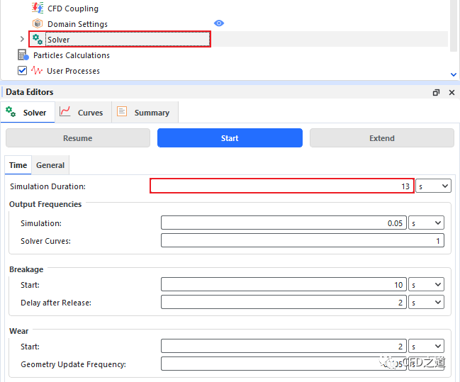 选中模型树节点 Solver,如下图所示设置Time选项卡中的参数