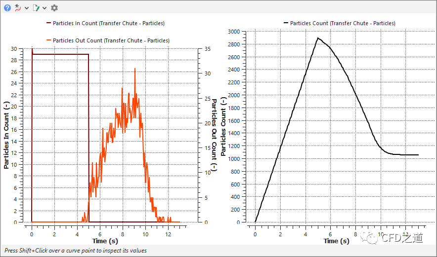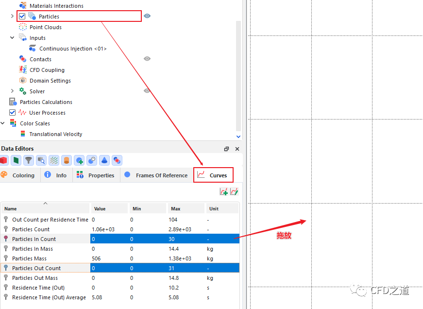 选中模型树节点 Particles,打开属性窗口中的Curves 选项卡,如下图所示选中Particles In Count与Particles Out Count,将其拖拽到右侧的图形窗口中绘制图形