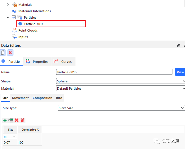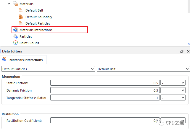 Rocky内置了三种材料:Default Belt、Default Boundary及Default Particles。本案例采用默认材料参数。