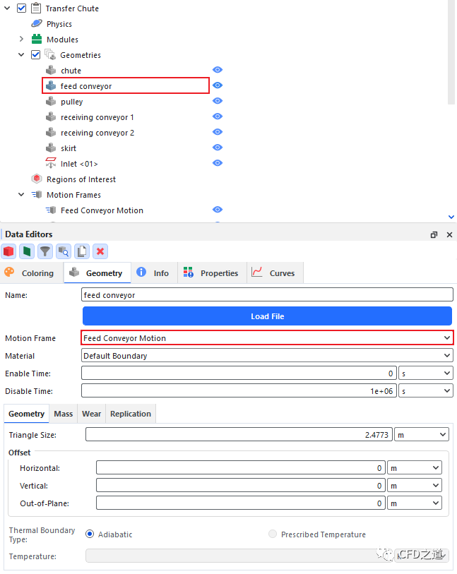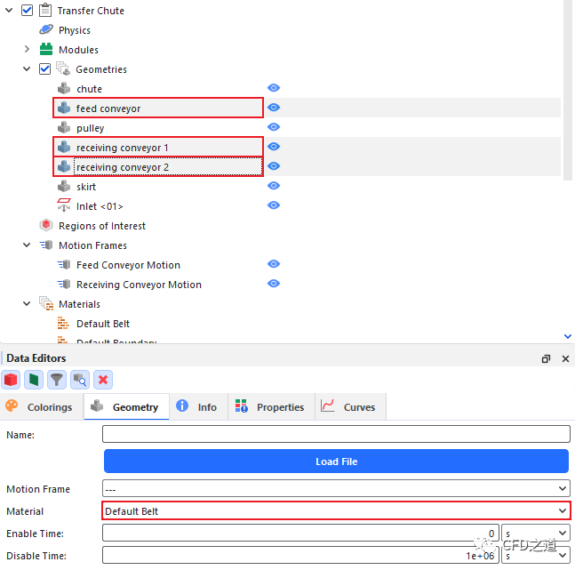 还需要将材料赋予几何部件。默认情况下,Rocky会为导入的所有几何模型指定材料Default Boundary,本案例需要指定皮带的材料。