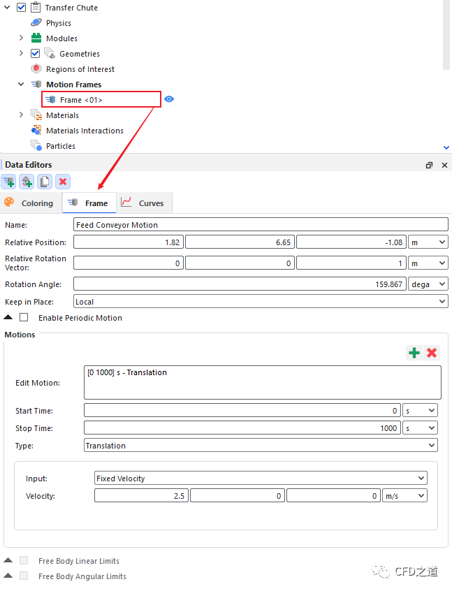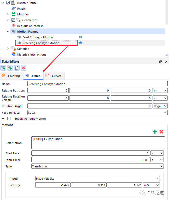 创建另一个Frame Motion,按下图所示参数,命名为 Receiving Conveyor Motion