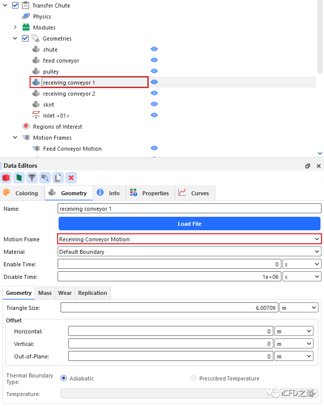 选中几何节点 receiving conveyor 1,指定参数Motion Frame为Receiving Conveyor Motion