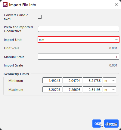弹出对话框中设置 Import Unit为mm
