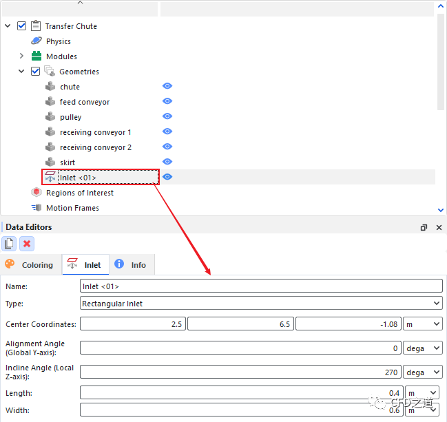 右键选择模型树节点 Geometries,点击弹出菜单项Create Inlet 创建颗粒入口