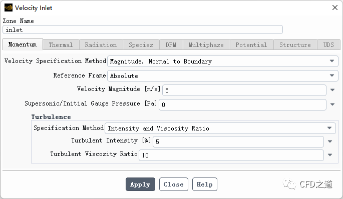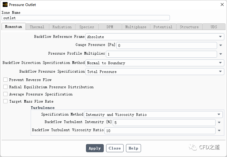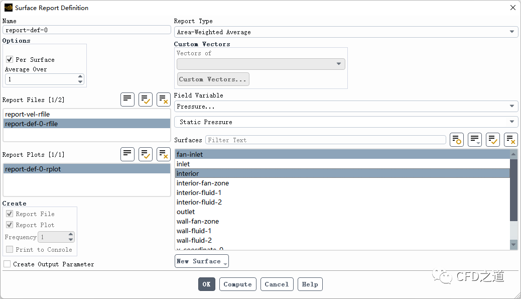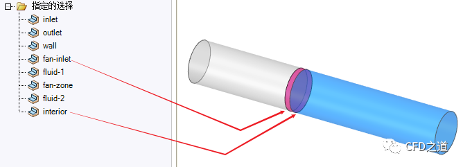 计算区域中包括一个入口inlet,一个出口outlet。边界fan-inlet与interior皆为内部面。