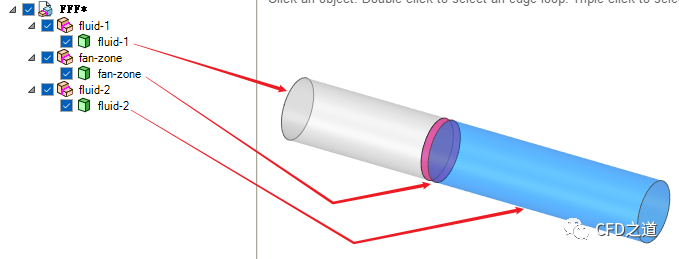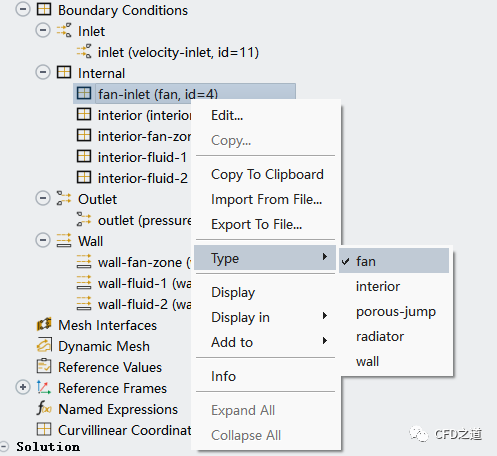 • 右键选择模型树节点fan-inlet,点击弹出菜单Type → fan 修改其类型为fan