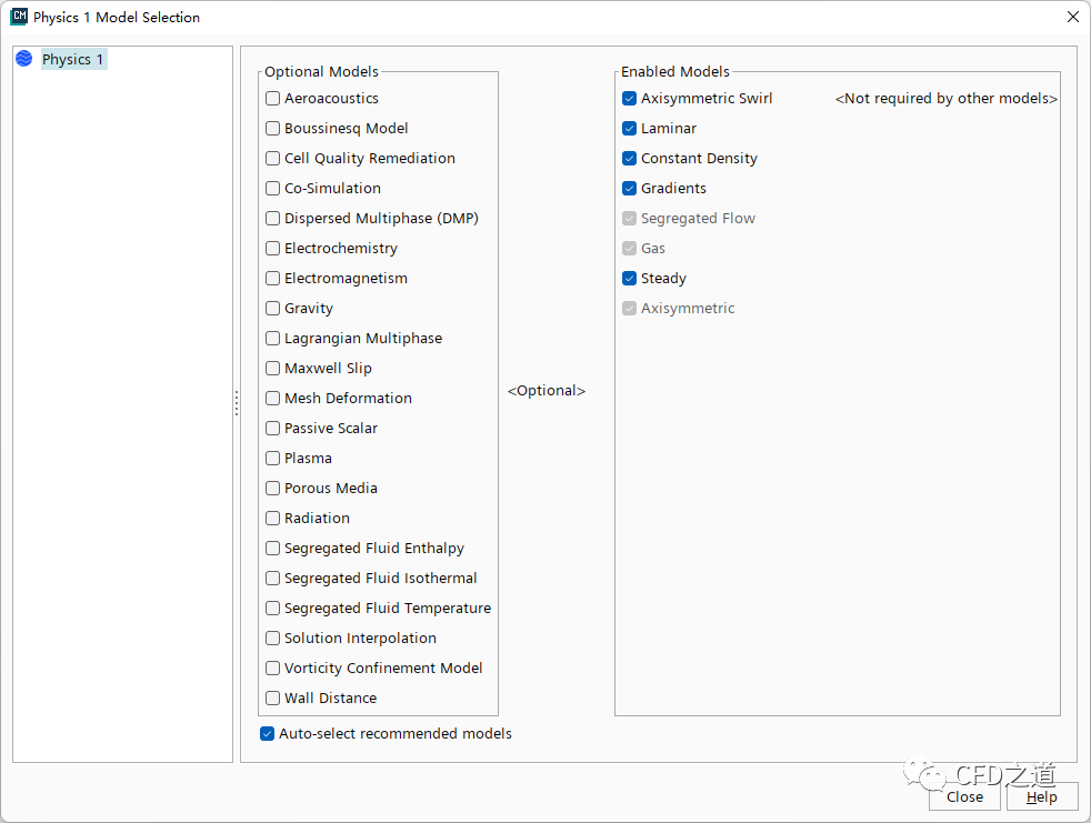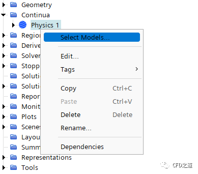 右键选择模型树节点Continua → Physics 1,点击弹出菜单项Select models…,弹出设置对话框