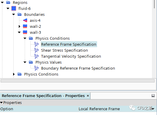 鼠标选中模型树节点Boundaries > wall-3 > Physics Conditions > Reference Frame Specification,属性窗口设置Option为Local Reference Frame,如下图所示