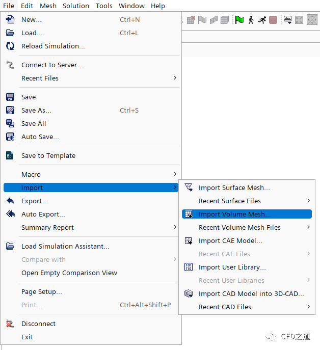 点击菜单File → Import → Import Volume Mesh…,在弹出对话框中选择网格文件EX8.cas导入网格