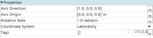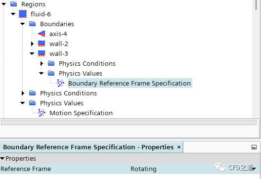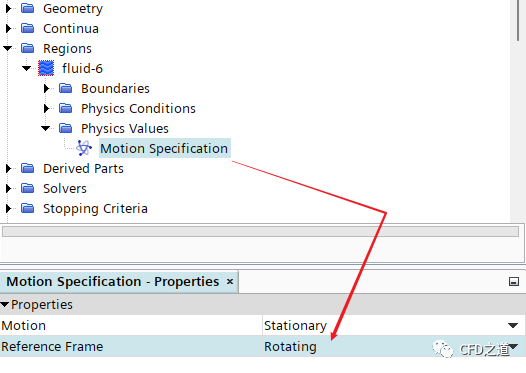 选择模型树节点Region > fluid-6 > Physics Values > Motion Specification,属性窗口设置Reference Frame为Rotating
