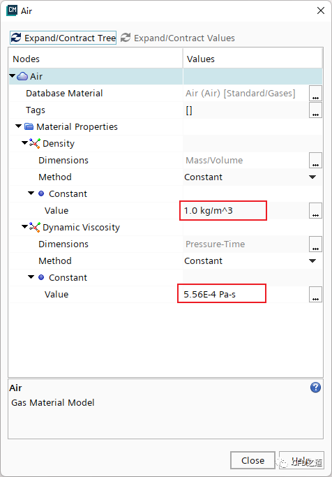 鼠标双击模型树节点Continua > Physics 1 > Models > Liquid > Air,弹出材料属性设置对话框,如下图所示 -