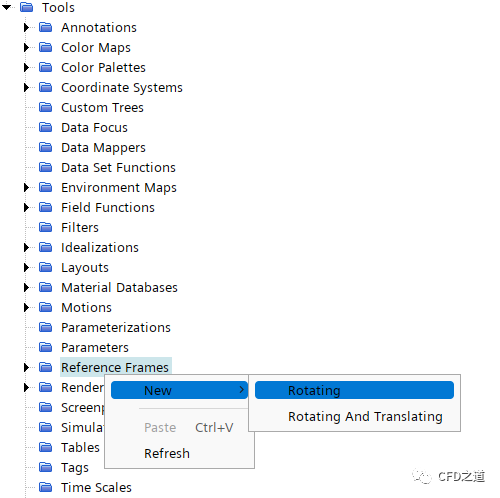 右键选择模型树节点Tools > Reference Frames,点击弹出菜单项New → Rotating