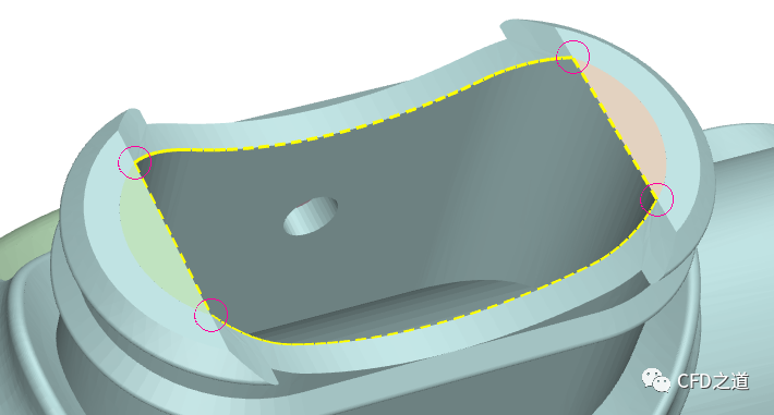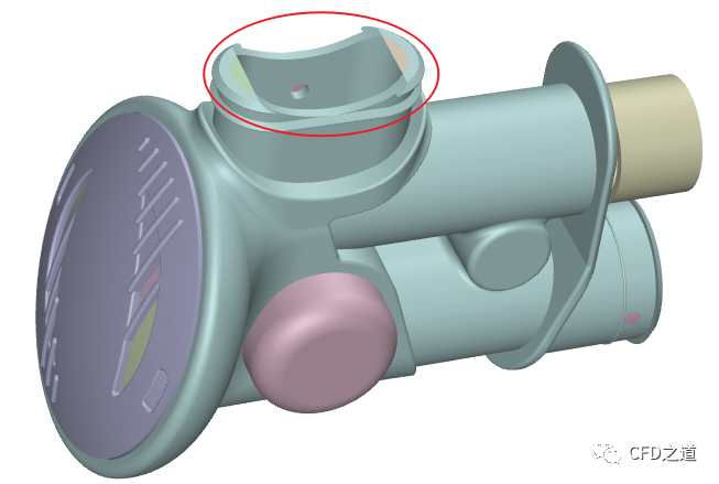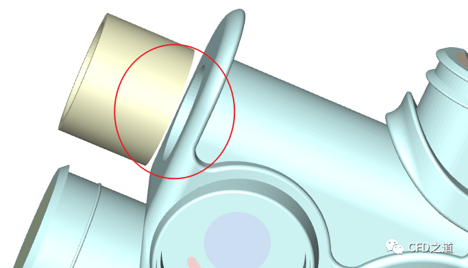 几何模型中存在孔洞,在创建流体计算域之前需要将孔洞堵上。如下图中框选位置的孔洞。