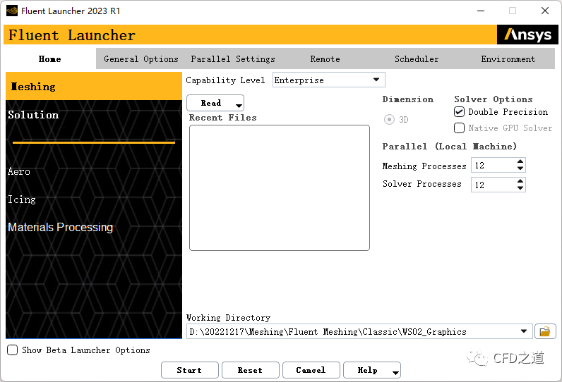 启动Fluent Launcher,选择列表项Meshing,并设置Working Directory ,点击Start按钮进入Fluent Meshing模式