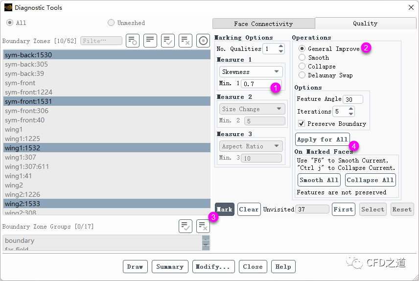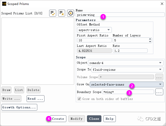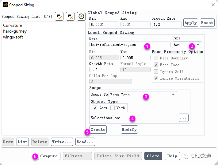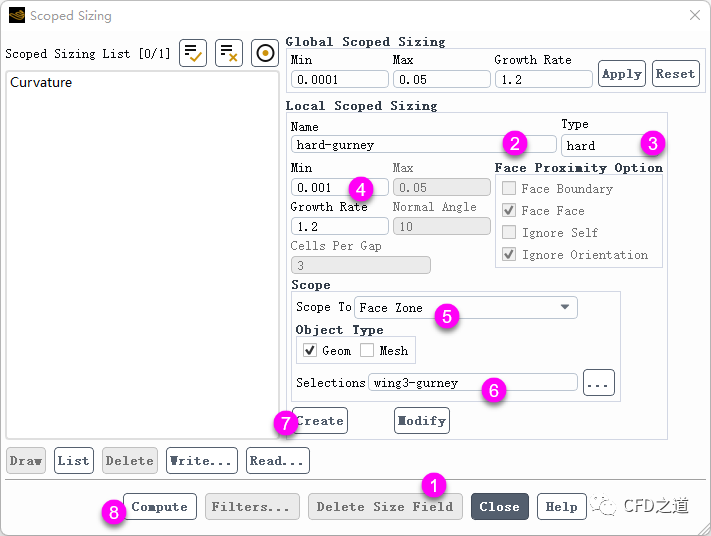 打开 Scoped Sizing对话框,如下图所示顺序进行操作,为wing3-gurney面指定单独的尺寸
