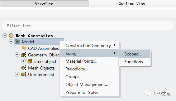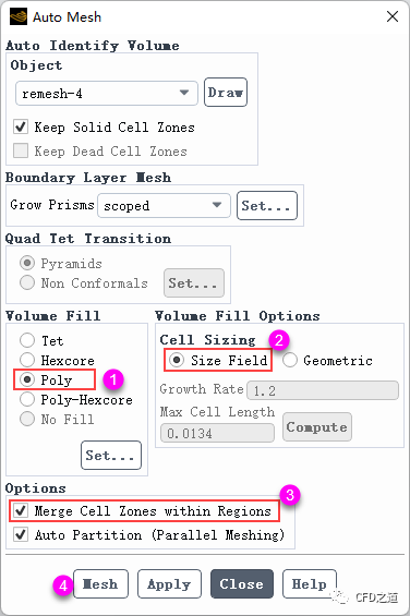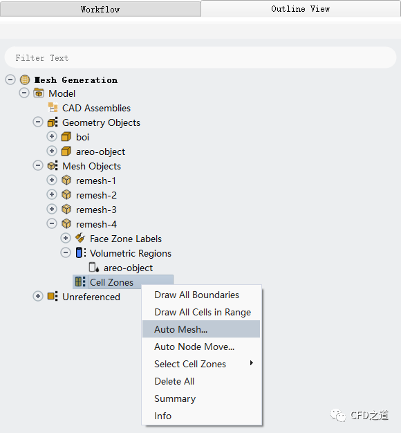 右键选择模型树节点 Cell Zones,点击弹出菜单项Auto Mesh… 打开设置对话框