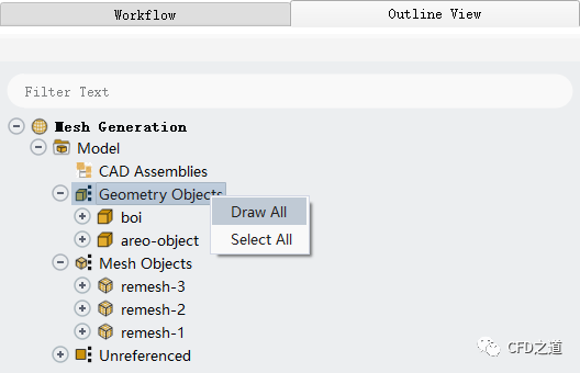 右键选择模型树节点 Geometry Objects,点击弹出菜单项Draw All 显示模型