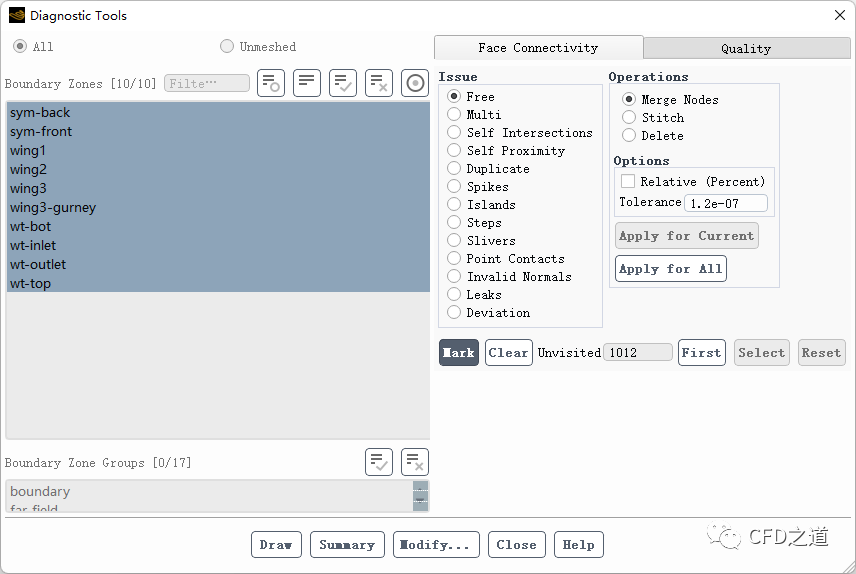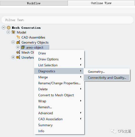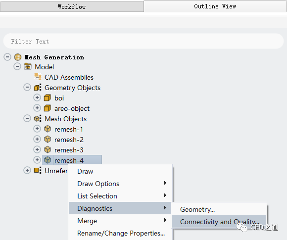 右键选择模型树节点 remesh-4,点击弹出菜单项Diagnostics → Connectivity and Quality… 打开对话框