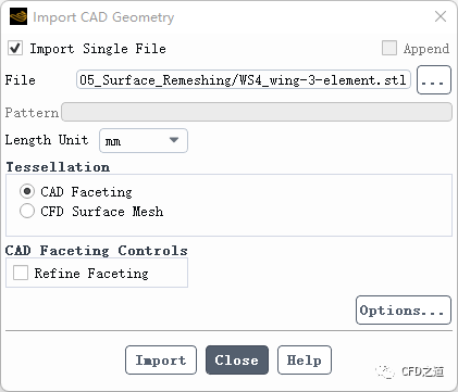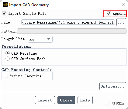 选择菜单File → Import → CAD… 打开文件导入对话框,激活选项 Append,导入几何文件WS4_wing-3-element-boi.stl