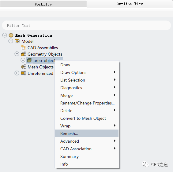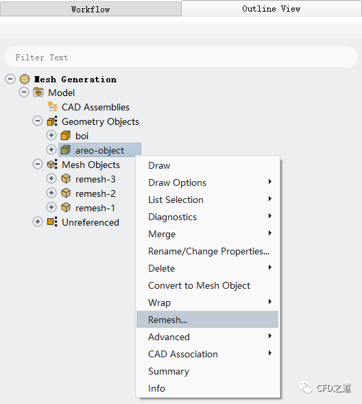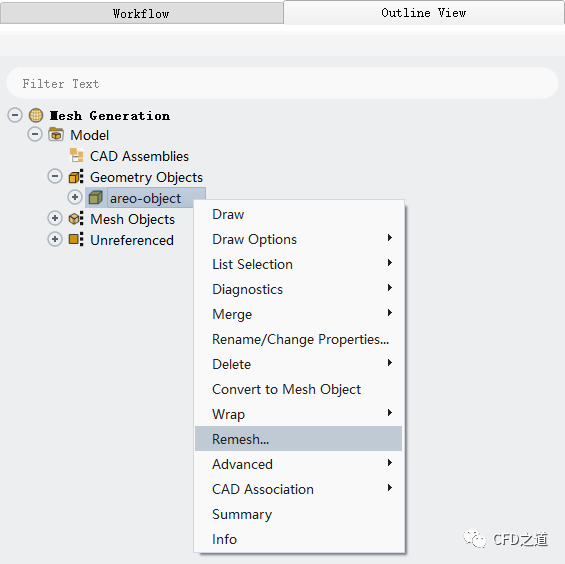 右键选择模型树节点areo-object,选择右键菜单Remesh...