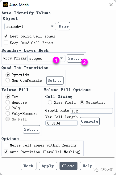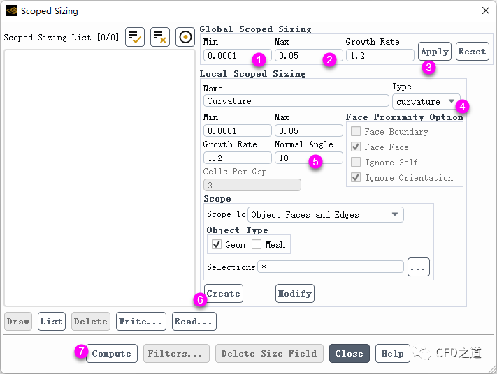 设置Global Scoped Sizing,设置Min为0.0001,设置Max为0.05,设置Growth Rate为1.2,如下图所示参数进行设置,点击Compute按钮