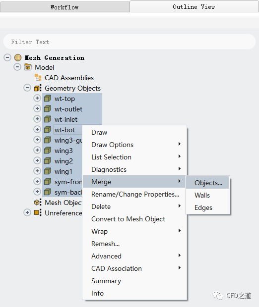 弹出对话框中输入名称为aero-object,点击Merge按钮合并所有几何
