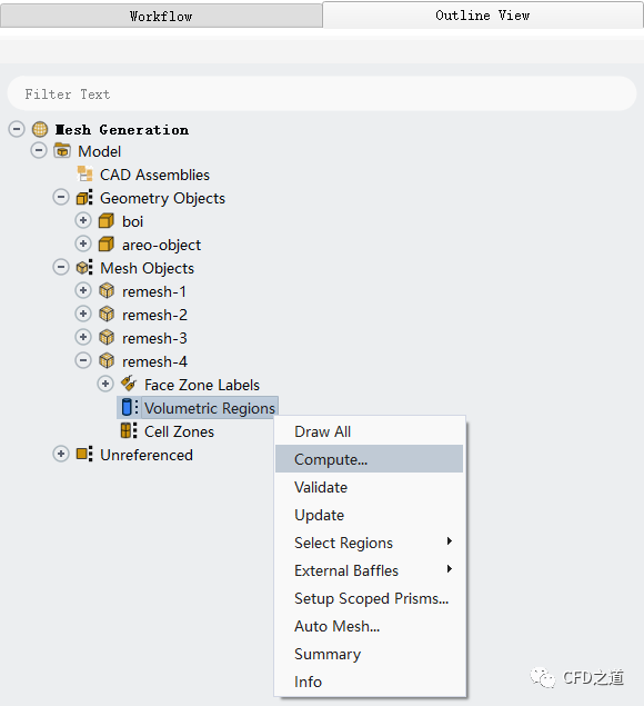 右键选择模型树节点 Volumetric Regions,点击弹出菜单项Compute… 创建计算区域