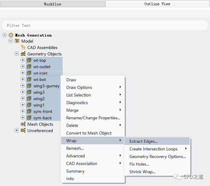 选择Geometry Objects节点下的所有项,点击鼠标右键,选择菜单Wrat → Extract Edges...