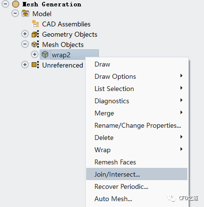 右键选择模型树节点 wrap2,点击Draw 显示模型,并点击按钮Join/Intersect… 打开对话框