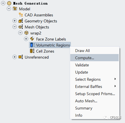 右键选择模型树节点 Volumetric Regions,点击弹出菜单项Compute… 打开设置对话框