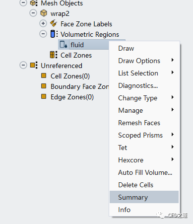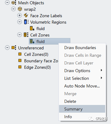 右键选择模型树节点 fluid,点击弹出菜单项Summary查看网格信息