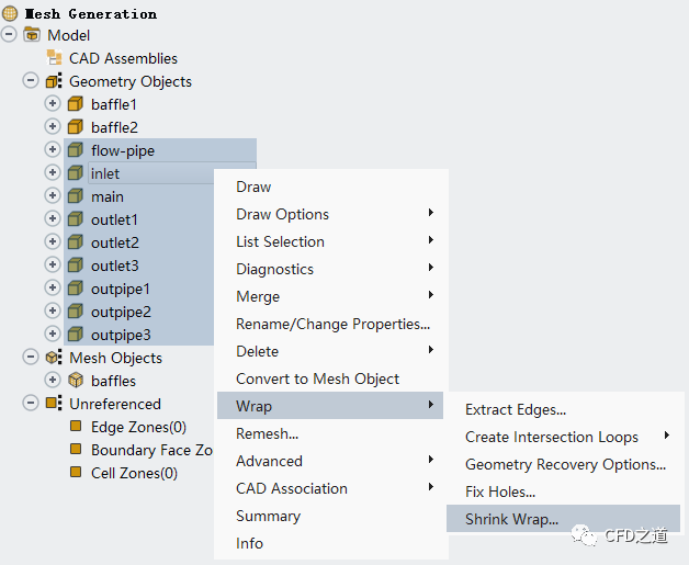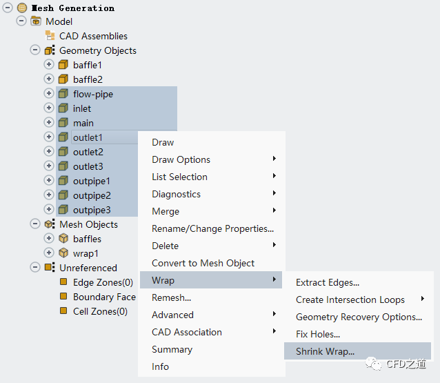 如下图所示,选择除挡板外的所有几何,点击右键菜单项Wrap → Shrink Wrap… 打开设置对话框