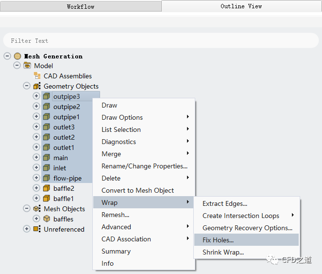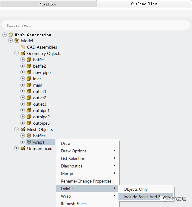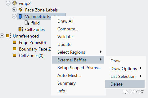 右键选择模型树节点 Volumetric Regions,点击弹出菜单项External Baffles → Delete 删除外部挡板