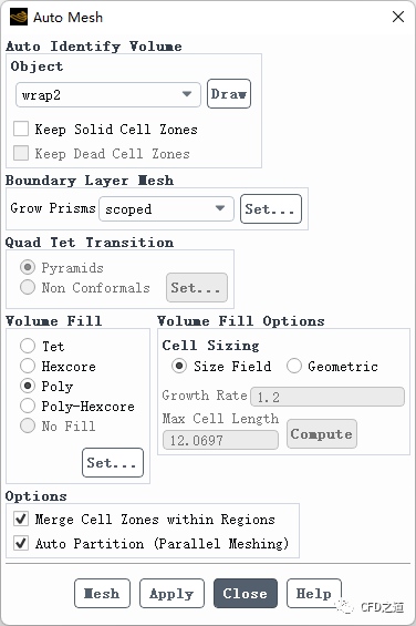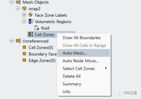 右键选择模型树节点 Cell Zones,点击弹出菜单项Auto Mesh… 打开设置对话框